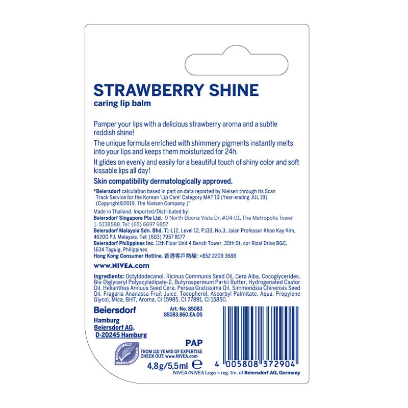 The innovative formula of NIVEA Fruity Shine Strawberry with Fruits Extracts and shimmering Pigments combines long-lasting moisturization and an exciting fruity scent leaving a touch of delicate color on soft and smooth lips.